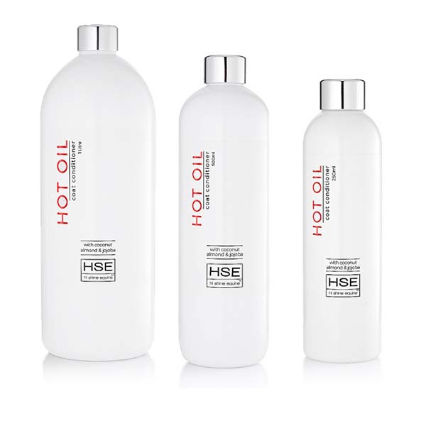 Three bottles of HSE Hot Oil Coat Conditioner on a white background. By Kylie Wallace | 29/09/2023 Three bottles of HSE Hot Oil Coat Conditioner on a white background.