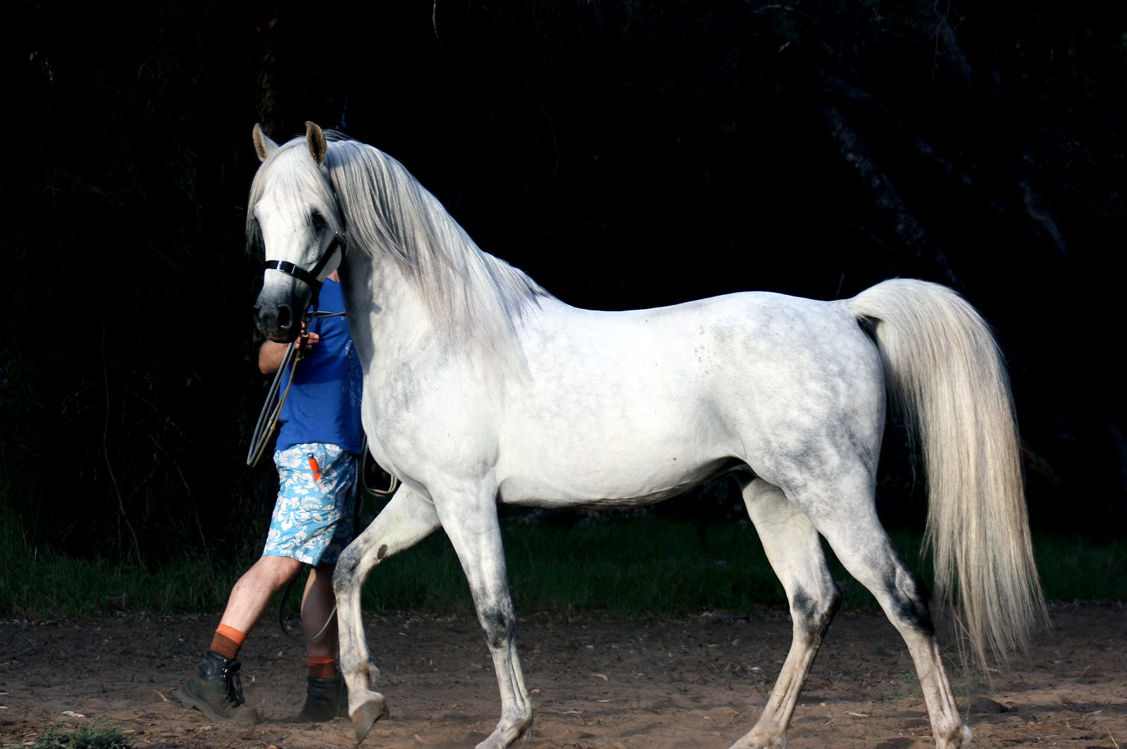 A white horse is being walked by a man.