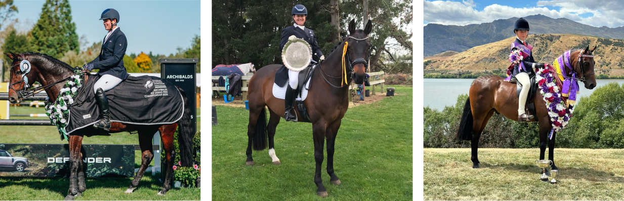 Three equestrians in competition attire are pictured with their horses. Each horse is adorned with awards and ribbons, and two riders hold trophies. The backgrounds include trees, hills, and banners.