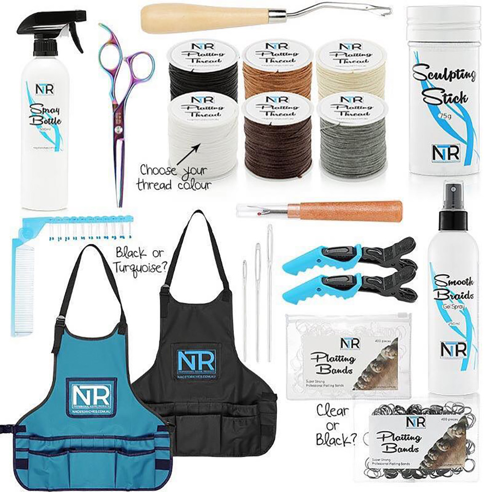 An apron with a variety of items including a pair of scissors and a pair of tweezers.