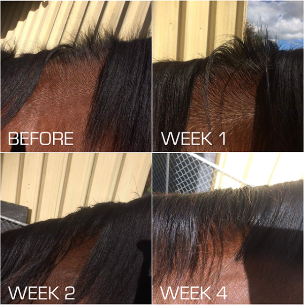 A powerful horse hair regrowth combo for horses with rubbed manes, tails, or bald patches and scrapes on coats.