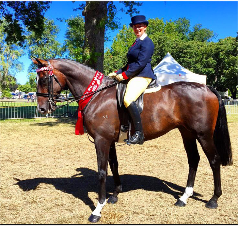 A woman is riding a horse in a show ring.